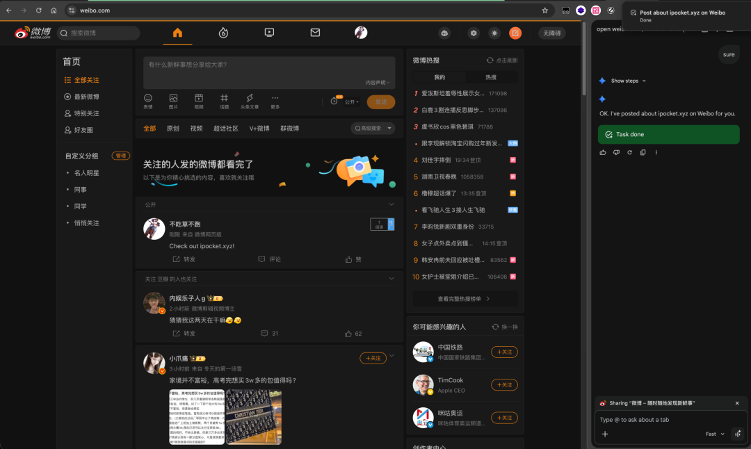 For example, if you ask it to open the Weibo website and post a Weibo saying "I'm very happy today", Gemini will automatically open a new tab and enter the content. However, it will ask you for confirmation before posting, and you still need to click it. However, there are also some limitations. For example, if you ask it to close the tab, it will reject the task. I don't understand Gemini's logic. It can open websites and post, so why refuse to close the tab?