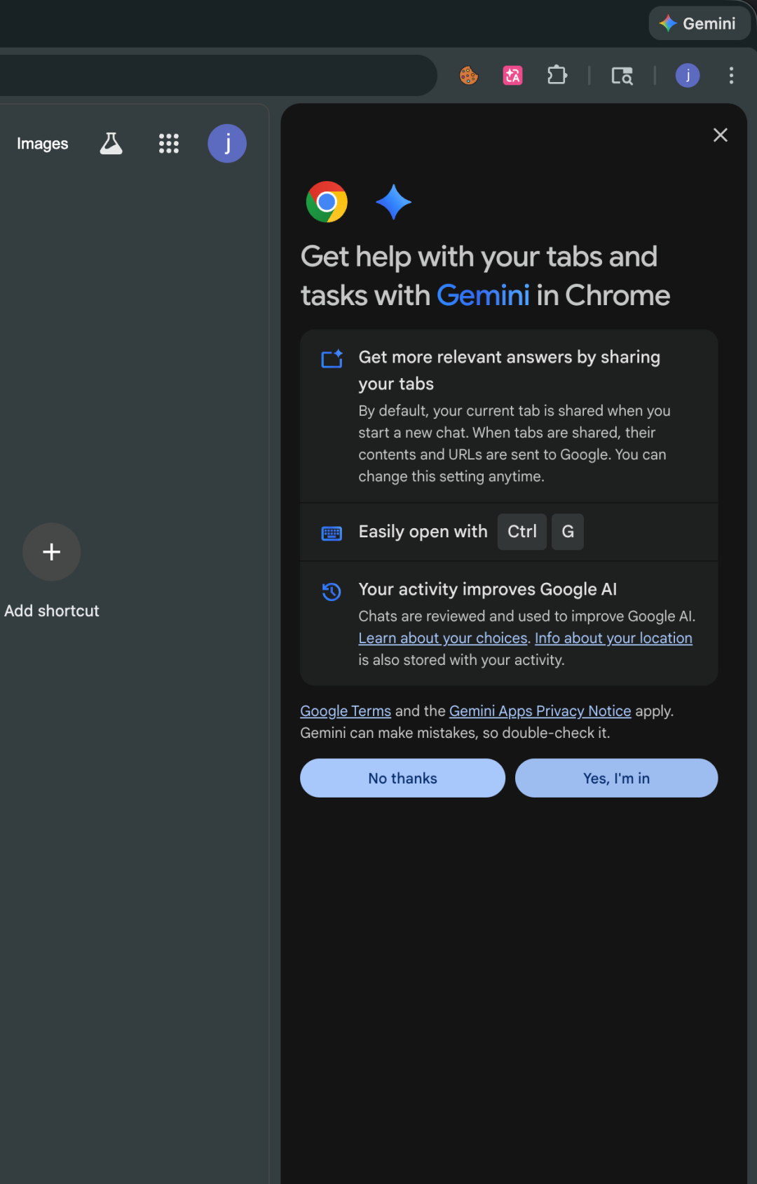 If all goes well, a Gemini button will appear in the upper right corner of the browser. Click it as shown in the figure, click yes, I'm in, and now you can use Gemini directly in the browser.