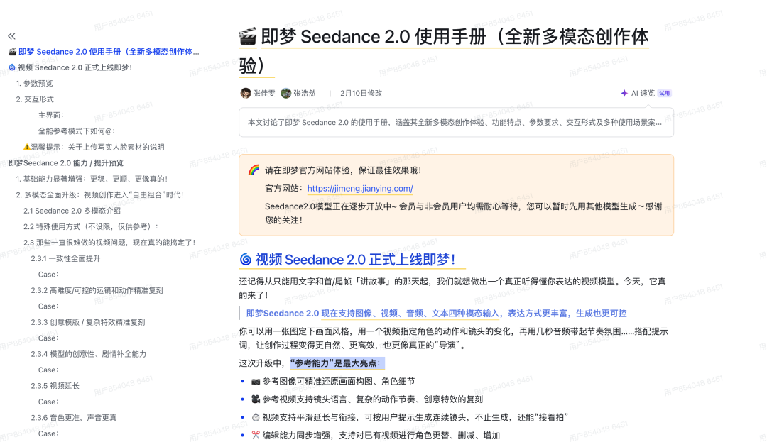 My Skill is quite professional. The process of creating it was actually very simple. A few days ago, Feishu Docs had an official Seedance2.0 user manual, which detailed how to use Seedance2.0, including the new multi-modal creation experience, features, parameter requirements, interaction forms, and scene examples. This manual is very detailed, but it's also very long, and many people may not be able to read it all.
