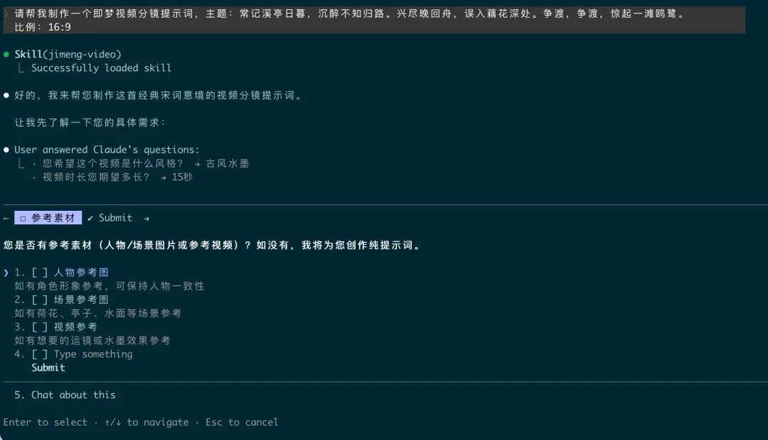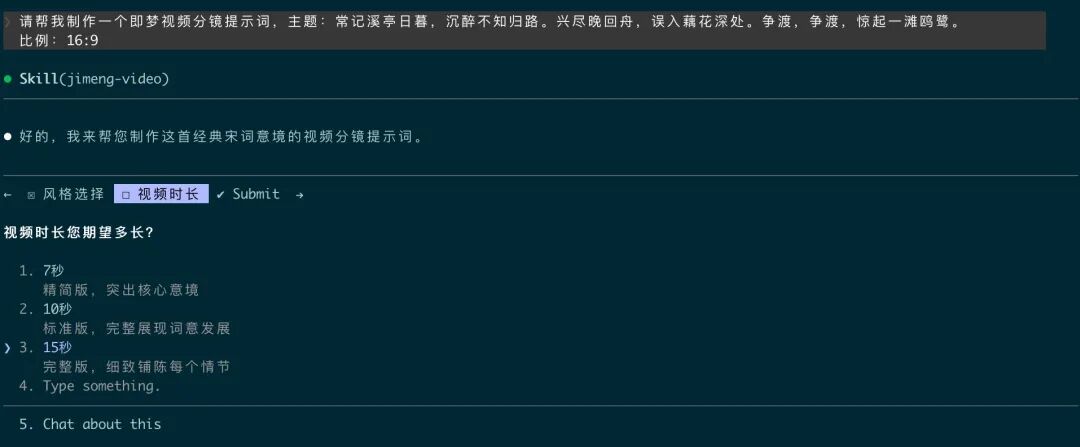 The final storyboard prompt it gave me included a complete 15-second shot design and sound effect timing, the effect is really top-notch!Finally, I used this Skill last night to create a video of "Peach Blossom Spring". Although I switched several accounts due to points issues and couldn't maintain character consistency, the meaning expressed and the effect presented were still good.