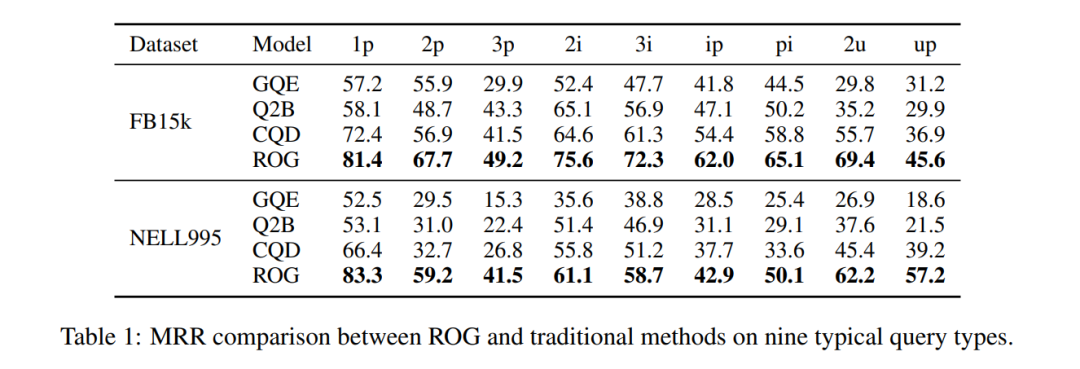 Table 1: FB15k dataset MRR comparison. ROG is fully leading, and the improvement of composite queries is the most significant.