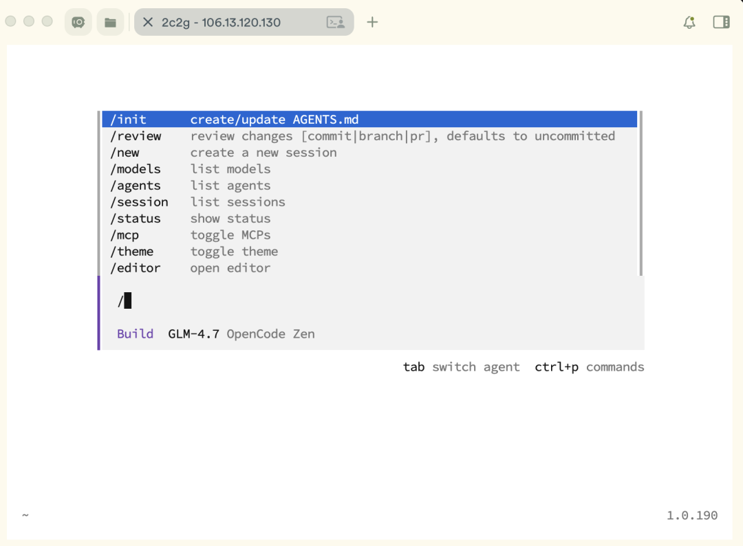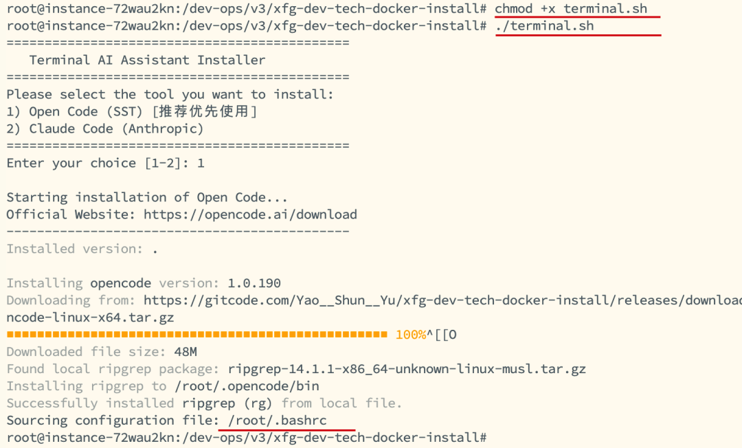 opencodeand then press Enter to enter the system. If it prompts that opencode is not a valid command, you can check if there is a promptsource .../bashrcduring the installation, and you can execute it yourself to refresh.