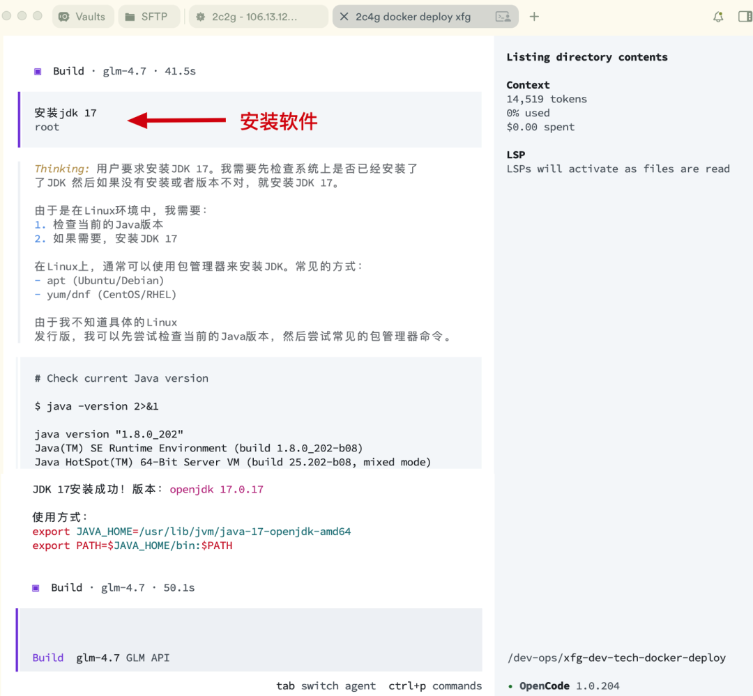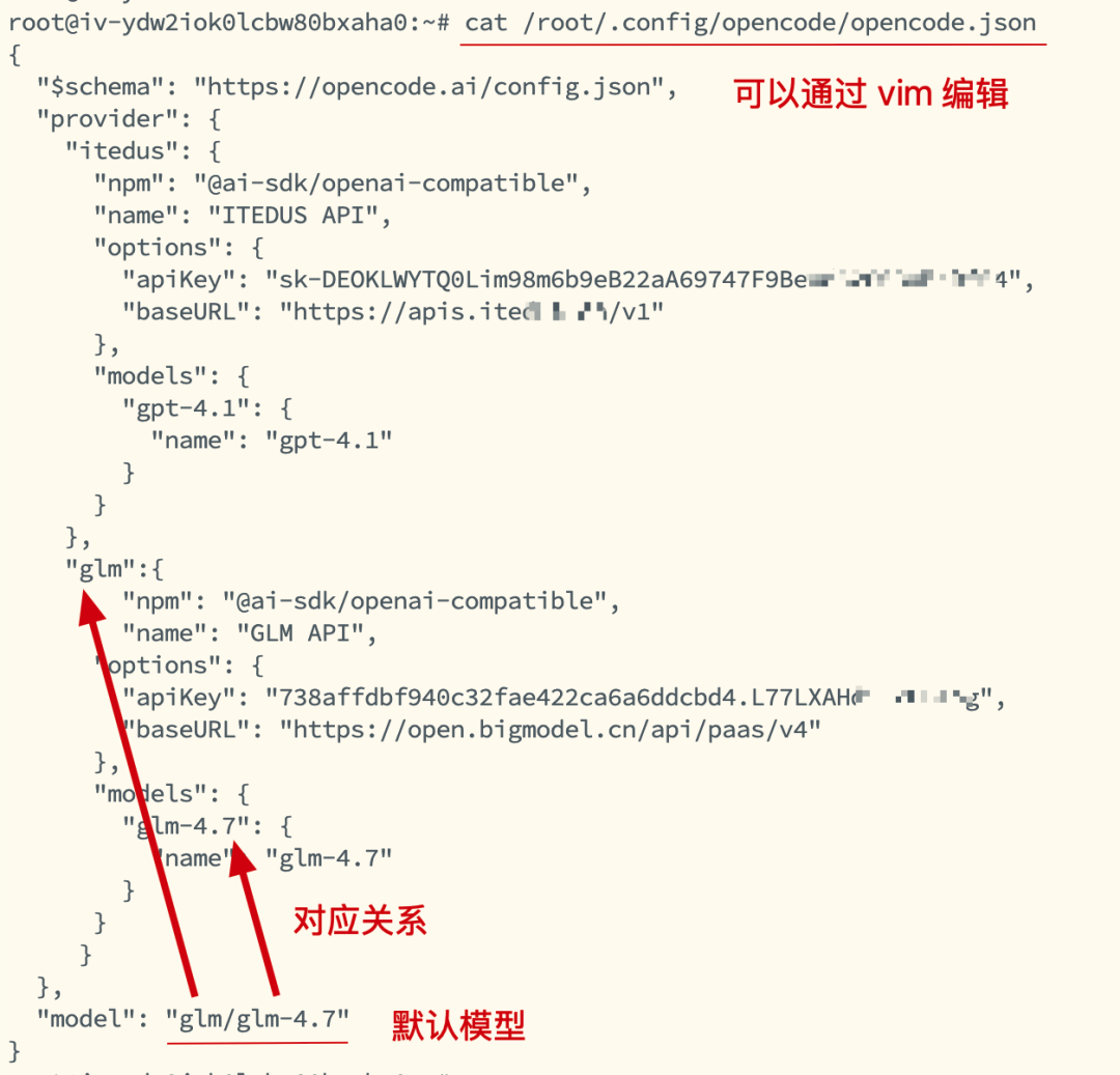 {"$schema":"https://opencode.ai/config.json","provider": {"my-model-openai": {"npm":"@ai-sdk/openai-compatible","name":"OpenAPI","options": {"apiKey":"your apikey","baseURL":"https://your baseURL/v1" },"models": {"gpt-4.1": {"name":"gpt-4.1" } } },"my-model-glm": {"npm":"@ai-sdk/openai-compatible","name":"GLMAPI","options": {"apiKey":"your apikey","baseURL":"https://open.bigmodel.cn/api/paas/v4" },"models": {"glm-4.7": {"name":"glm-4.7" } } } },"model":"my-model-openai/gpt-4.1"} - If you want to replace the model yourself, such as using openai or claude, then you need to replace it in terminal/opencode.json under the script, and then execute ./opencode.json.sh to create it.- If you have executed ./opencode.json.sh and want to change the configured model, you can edit /root/.config/opencode/opencode.json using the vim command.