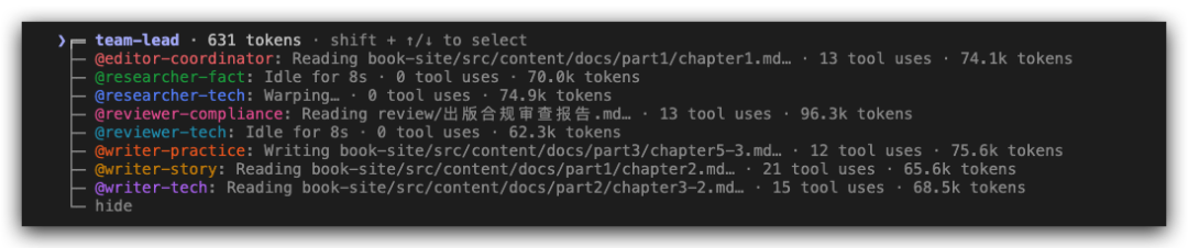 The lead's terminal lists all teammates and their work. Use Shift+Up/Down to select a teammate and message them directly.