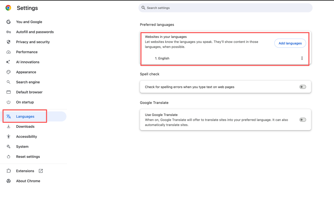 Then, go to the chrome://settings/languages page and set the preferred language to English.