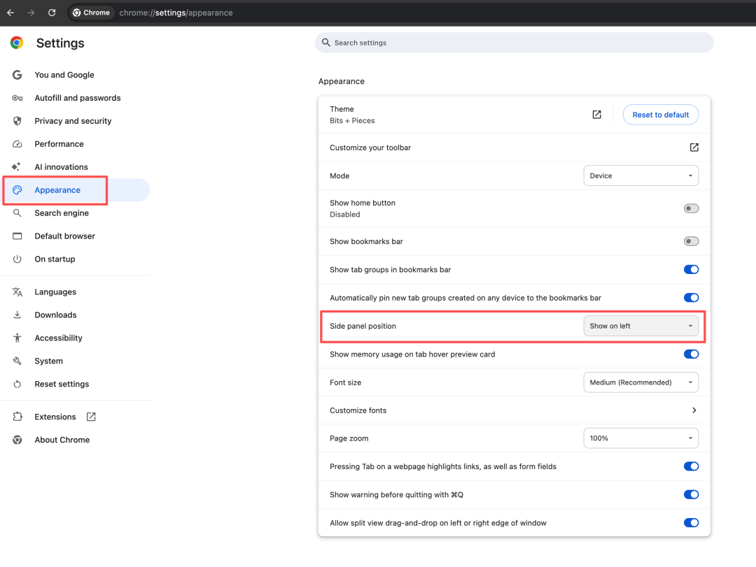 That’s right, set it to left, because this controls the traditional Side panel. It and the Gemini you just enabled are on the left and right sides, understand?