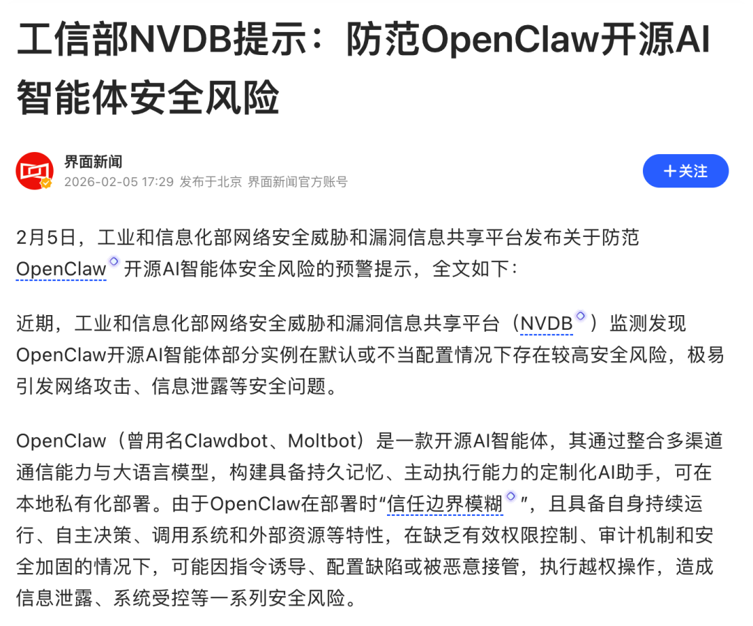 On February 5th, China's Ministry of Industry and Information Technology's National Vulnerability Database (NVDB) officially issued a warning, indicating that OpenClaw has a high security risk under default or improper configuration, which can easily lead to network attacks, information leakage and other security problems. This marks the rise of the OpenClaw incident from discussions in the technical community to national-level security concerns.
