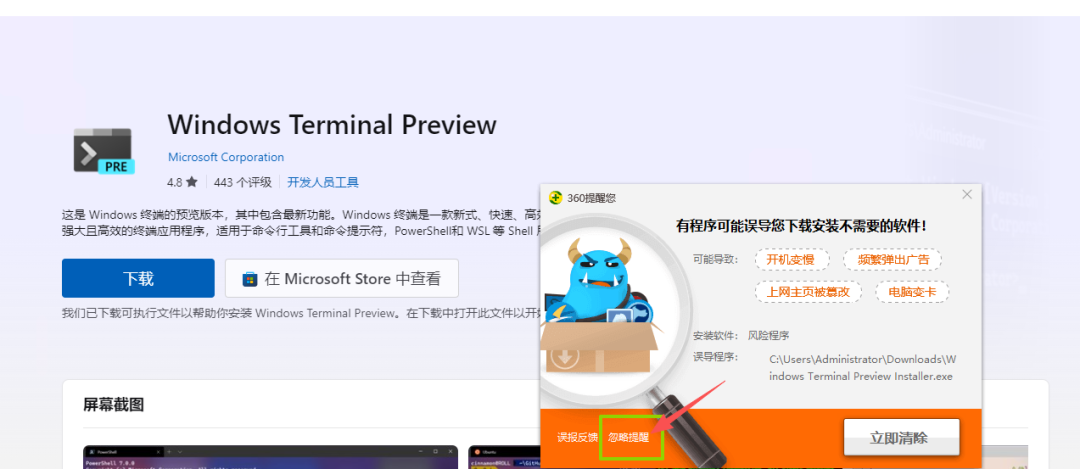 Clicking download will download an exe program: Windows Terminal Preview Installer.exe. Note that if you have antivirus software installed, there might be a risk warning; just choose to ignore it.