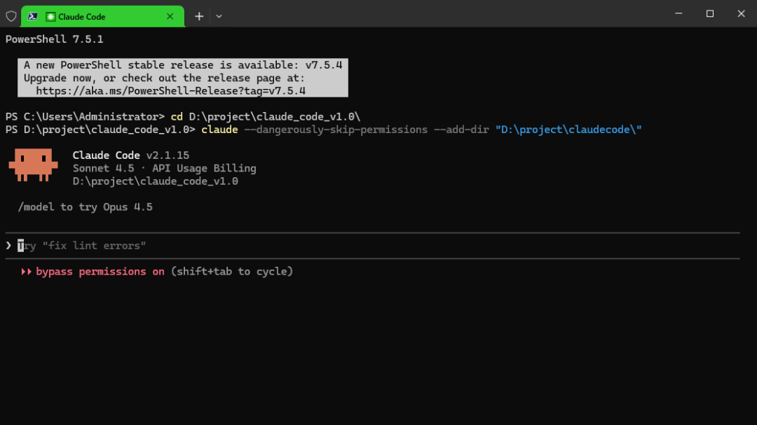 Once installed, you can open it directly; it defaults to PowerShell, and typing claude starts it. Interestingly, it also supports auto-completion, as shown in the gray file directory in the image below.